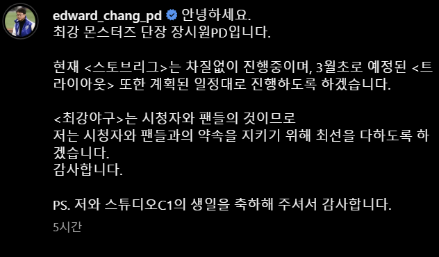 그러나 이 글이 올라온 후 ‘최강야구’ 연출을 맡은 JTBC 산하 레이블 스튜디오 C1의 대표 장시원 PD는 반박 글을 게재했다. 장 PD는 “현재 스토브리그는 차질 없이 진행 중이며, 3월 초로 예정된 트라이아웃 또한 계획된 일정대로 진행하도록 하겠다”며 “‘최강야구’는 시청자와 팬들의 것이므로 저는 시청자와 팬들과의 약속을 지키기 위해 최선을 다하도록 하겠다”고 말했다.