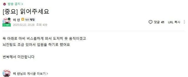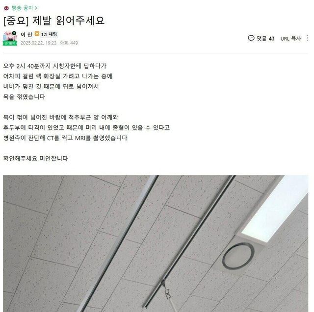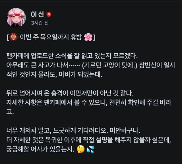 이신이라는 노래하는 버튜버 화장실 갈려고 하는데 고양이가 갑자기 달려들어서 놀래 가지고 뒤로 넘어짐 병원에서는 마비증세 판단 받을가능성 있다함. 좀더 지켜보겠지만