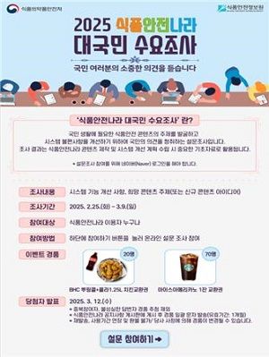 식품의약품안전처(처장 오유경)가 2월 25일부터 3월 9일까지 식품안전나라 ‘2025년 대국민 수요조사’를 실시한다.