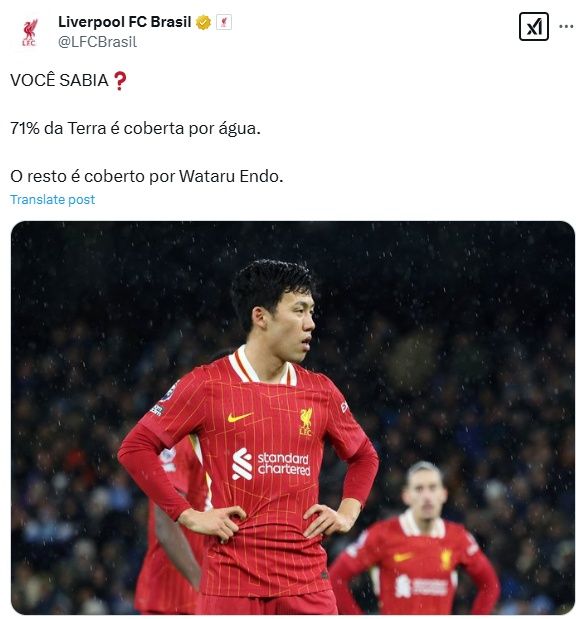 매체에 따르면 맨시티전이 끝난 후 리버풀의 공식 브라질 사회관계망서비스(SNS) 계정은 "지구의 71%는 물로 덮여 있고, 나머지는 엔도 와타루가 덮고 있다"라며 엔도를 칭찬했다.