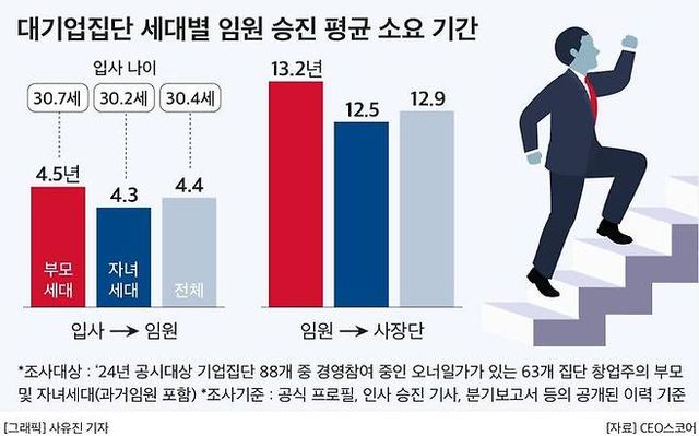 자녀세대가 부모세대보다 입사와 승진 시기가 빨랐다. 부모세대는 평균 30.7세에 입사해 4.5년 만에 임원을 달고 13.2년 만에 사장단으로 승진했다. 자녀세대는 이보다 어린 평균 30.2세에 입사해 임원 승진까지 4.3년, 사장단 승진까지 12.5년이 걸렸다.