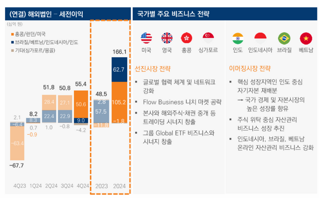 미국법인은 지난해 세전이익 945억원을 거둬 창사 이래 최대 실적을 달성했다. 이에 힘입어 세전이익 기준 지난 2023년 적자였던 선진국(홍콩·런던·미국) 지역도 흑자 전환에 성공했다. 인도법인의 브로커리지 수익이 늘며 이머징시장(브라질·베트남·인도네시아·인도) 세전익도 전년 대비 52억원(9%) 증가한 627억원을 기록했다.