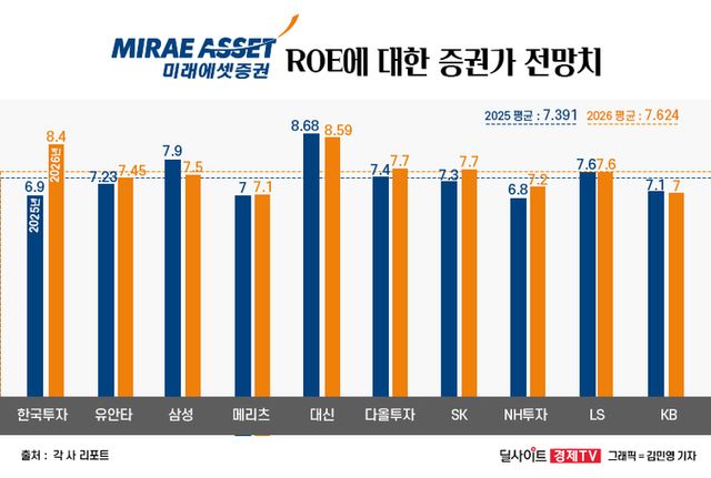 이들 리서치가 전망한 올해 ROE 예상 평균은 7.391%, 내년 평균은 7.624%로, 지난해 잠정 ROE(7.7%)에도 못 미쳤다. 대신증권이 올해와 내년 전망치를 각각 8.68%, 8.59%로 제시해 가장 높았는데, 이 역시 미래에셋증권의 목표 ROE인 10%에 비하면 모자란 수치다. 올해보다 내년 ROE를 낮게 제시한 리서치도 3곳이나 됐다.