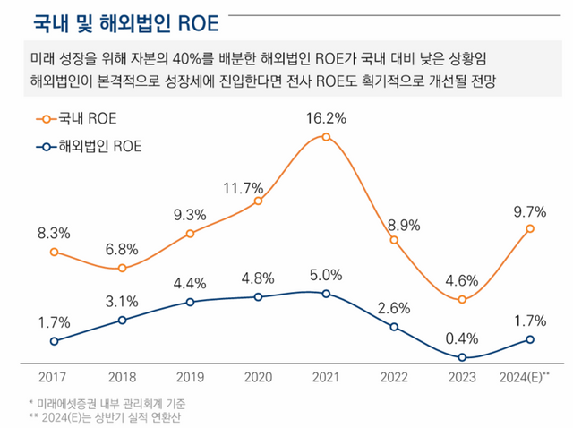 미래에셋증권도 이같은 문제를 인식하고 있다. 미래에셋증권은 지난해 밸류업 공시에서 “미래성장을 위해 자본을 배분한 해외법인의 ROE가 국내 대비 낮다”고 자평했다. 실제 해외법인 ROE는 지난 2017년 이후 국내 자본 기준 ROE를 넘어선 적이 단 한차례도 없다.