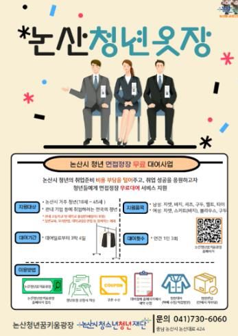 ‘논산청년옷장’은 청년들의 취업 준비 비용 부담을 줄이기 위해 면접 정장을 무료로 대여하는 사업으로, (사)열린옷장(서울 광진구 소재)과 협약을 체결해 서비스를 제공한다.