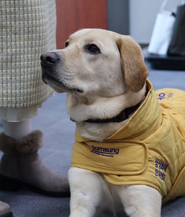 함께 올라온 사진 속 태백은 ‘삼성화재 안내견학교’ 문구가 적힌 노란색 옷을 입고 김예지 의원실 한편에 자리하고 있는 모습이다.