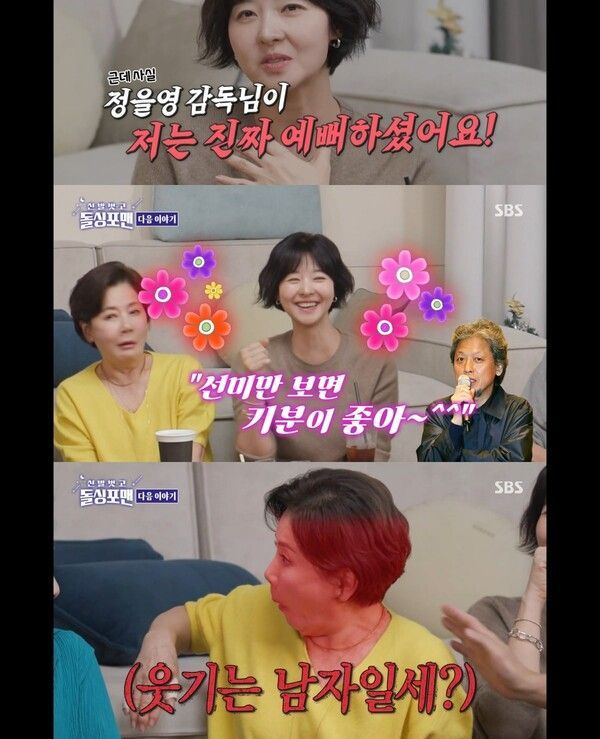 그 순간 함께 출연한 배우 송선미가 “정을영 감독님이 절 진짜 예뻐해서 ‘선미만 쳐다보면 기분이 좋다’고 하셨다”고 말하자, 박정수는 깜짝 놀란 표정을 지어 웃음을 자아냈다.