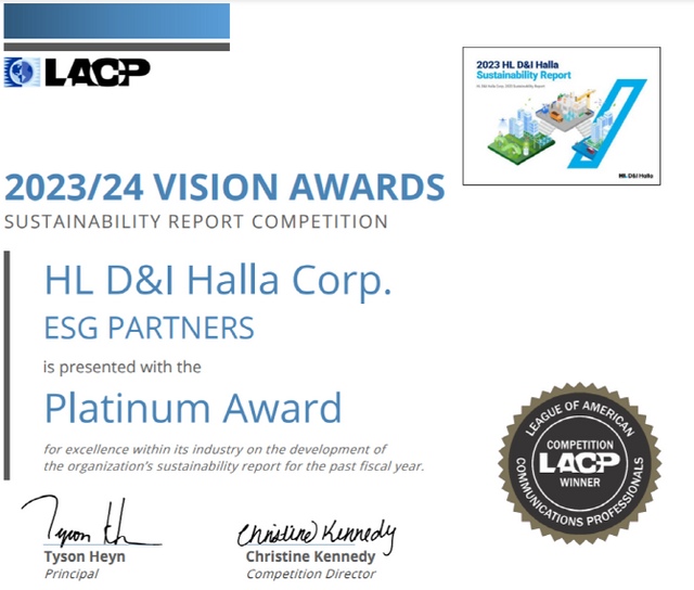 HL D&I한라 지속가능경영보고서 LACP 수상 인증서. © HL D&I한라