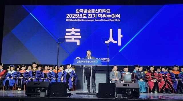 박준희 회장은 2025년 2월 19일 한국방송통신대학교 개교 이래 최초로 경영학 명예졸업증서을 받은 제1호로 2025년 전기 졸업생들에게 축사을 진행했다. / 사진제공=아이넷방송그룹