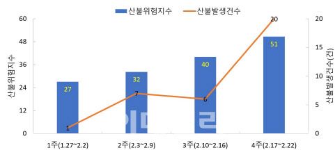 산림청, 기상청, 국립산림과학원 등에 따르면 올해 2월 산불위험지수를 분석한 결과, 이달 후반으로 갈수록 산불위험지수가 점차 증가하는 추세를 보이고 있다. 이달 마지막주는 첫째주에 비해 산불위험지수는 27에서 51으로 24 증가했으며 산불발생 건수도 1건에서 20건으로 19건 늘었다.