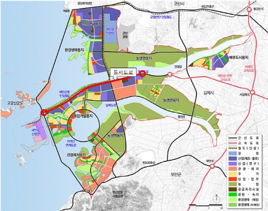 총길이 16.47㎞의 새만금 동서도로는 종으로는 새만금 남북도로와 교차하며, 횡으로는 새만금-전주 고속도로에 연결되는 새만금 간선 도로망의 동서 중심축이다.