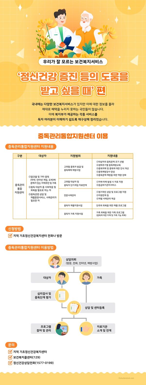 지난 ‘치료가 어려운 질환을 앓고 있을 때’ 편에 이어 ‘정신건강 증진 등의 도움을 받고 싶을 때’ 신청할 수 있는 각종 지원제도를 소개합니다. 두 번째 순서는 ‘중독관리통합지원센터’ 이용지원제도입니다. 이 제도는 지역사회의 중독자를 조기발견해 상담·치료·재활 및 사회복귀를 지원합니다. 전국에 50곳이 운영되고 있으며 일반인 중독문제는 물론 노숙인 등 취약계층의 자활을 돕는 서비스도 제공합니다.