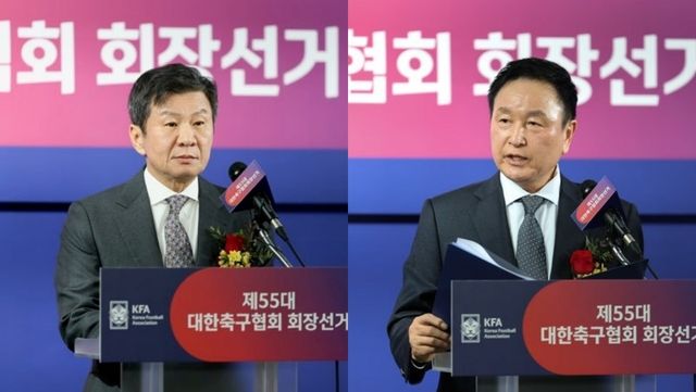 제55대 대한축구협회장 선거에 출마한 정몽규 후보와 허정무 후보 / 뉴스1 (대한축구협회 제공)