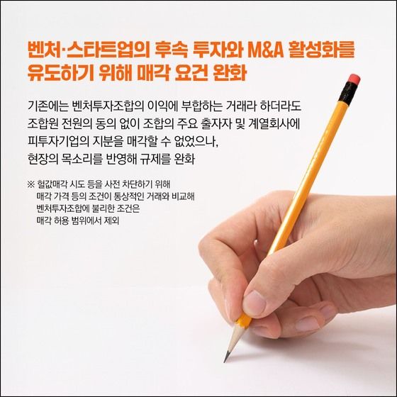 기존에는 벤처투자조합의 이익에 부합하는 거래라 하더라도 조합원 전원의 동의 없이 조합의 주요 출자자 및 계열회사에 피투자기업 지분을 매각할 수 없었으나, 벤처·스타트업의 후속 투자와 M&A 활성화를 유도하기 위해 매각 요건 완화가 필요하다는 현장의 목소리를 반영해 규제를 완화했다.