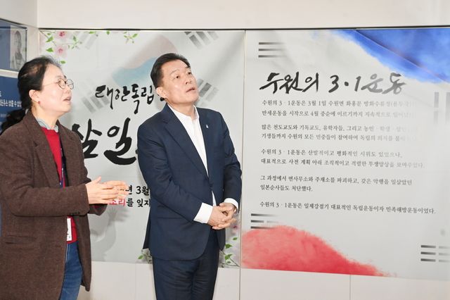 이재준 수원시장은 26일 전시장을 찾아 전시물을 관람하고, “수원의 독립운동가를 시민들에게 널리 알리길 바란다”고 말했다.