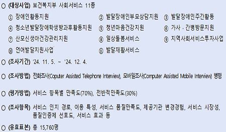 이번 조사는 사회서비스 이용자 만족도 파악을 통해 국민에게 제공되는 사회서비스 품질향상을 목적으로 2007년부터 매년 실시하고 있으며, 2024년에는 1만 5,760명을 대상으로 리서치앤리서치에 의뢰하여 실시했다.