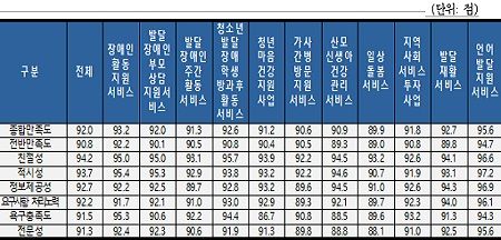 다음으로 ‘장애인활동지원서비스’(93.2점), ‘발달재활서비스’(92.7점) 순으로 만족도가 높아 장애인과 장애인 가족을 지원하는 사회서비스가 높은 점수를 받았다.