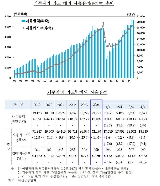 해외에서 사용한 카드 수는 7만 2490장으로 전년대비 14% 증가했다. 장당 사용금액은 300달러로 0.9% 감소했다. 카드 종류별로는 신용카드가 154억 8700만달러로 5.4% 늘었고, 체크카드는 62억 3400만달러로 37.8% 급증했다. 신용카드 사용액이 더 크진 하지만 ‘트래블 월렛’과 같은 선불카드 형태의 해외 여행을 위한 카드 서비스가 늘면서 체크카드 사용액 비중이 빠르게 확대되고 있는 것으로 보인다.