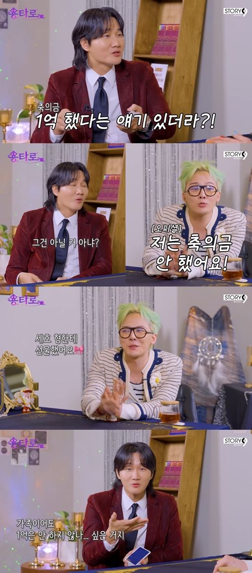 지드래곤은 "저는 축의금 안 했다. 저는 세호 형한테 선물했다"라고 해명했다. 이에 이용진은 "유튜브, 릴스 보면 '조세호 결혼식 TOP3'라고 뜬다"라며 자신이 본 영상을 따라했다.