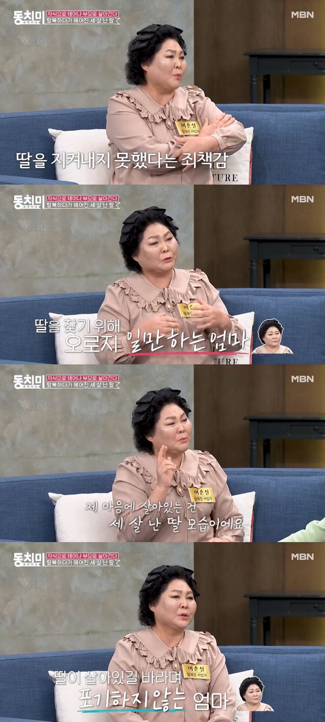 "죽어라 돈 버는 것도 아이 찾을 브로커를 사기 위해서다"라는 그는 "그래도 북한이 아닌 중국 땅에서 헤어졌기에 살아있다는 끈을 잡고 찾고 있다. 내 마음에 살아있는 건 오직 세 살 난 딸의 모습이다. 무너질 수 없다. 이 아이 찾기 전엔 포기 안한다"고 이야기했다.
