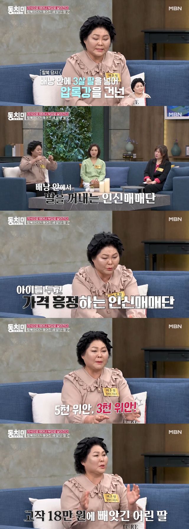 이순실은 "내가 그 아이의 흔들림을 느껴서 안으려고 하는데 남자들이 아이를 안고 떨어지게 됐다"며 "너무 가슴 아픈 건. 제일 추억하기 싫은 건 아이를 살리기 위해 강 건넌 엄마를 앞에 두고 아이를 셋이서 2천, 3천하며 흥정하더라. 결국 아이는 3천 위안에 갔다. 중국돈 3천 위안은 당시 한국 돈으로 18만 원이라고 한다. 그 18만 원에 아기가 남자들 손에 갔다. 저는 저대로 싼 돈으로 팔려갔다"고 밝혔다.