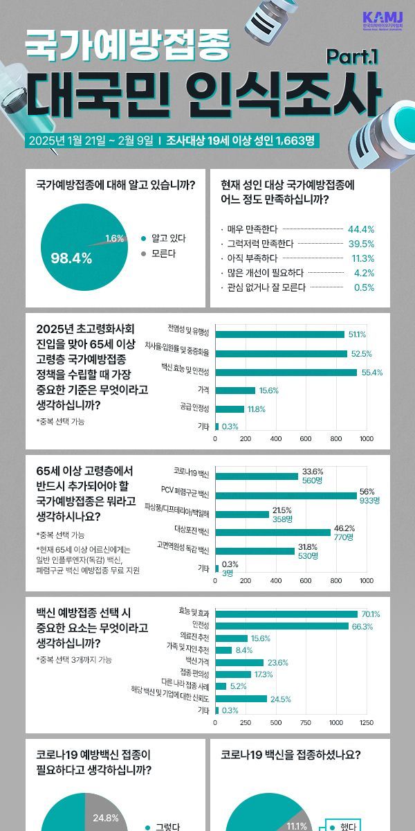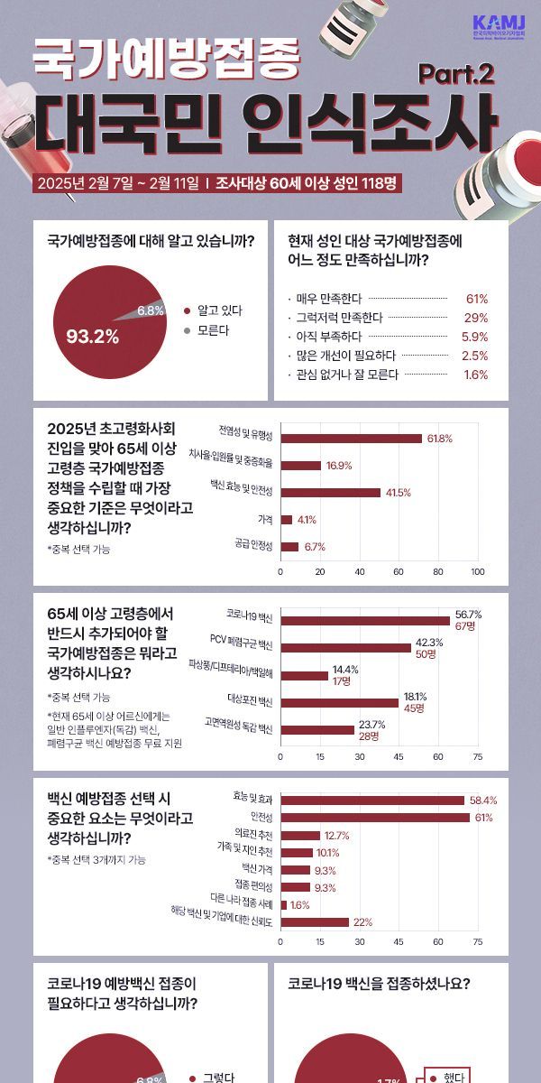 반드시 추가돼야 하는 고령층 국가예방접종으로는 ‘PCV 폐렴구균백신(56%)’을 가장 많이 선택했다. 뒤이어 ‘대상포진 백신’(46.2%), ‘코로나19 백신’(33.6%) 순으로 나타났다.