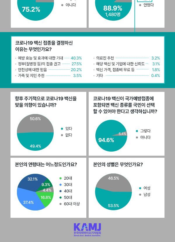 한편 코로나19 백신이 국가예방접종에 포함된다면 백신 종류를 직접 선택할 수 있어야 한다는 질문에는 60세 이상 노인 대상, 19세 이상 전체 성인 대상 설문에서 각각 97.5%, 94.6%가 ‘그렇다’고 응답해 연령대별 의견 차이가 거의 없는 것으로 드러났다. 백신접종 시 개인의 선택권 보장이 중요하다는 점에는 응답자 대다수가 동의한 것이다.