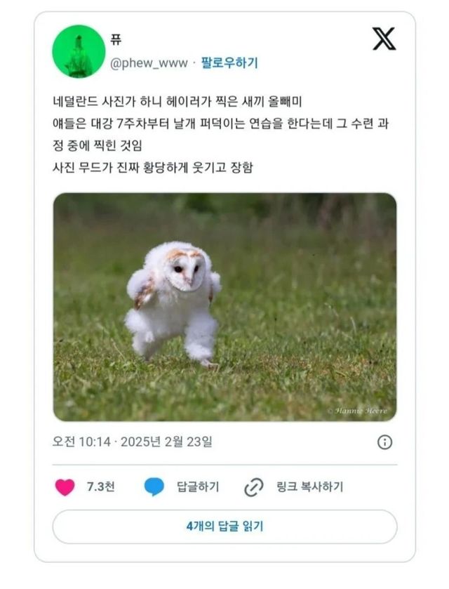 네덜란드 사진가가 찍은 새끼 올빼미가 걸어가는 장면인데