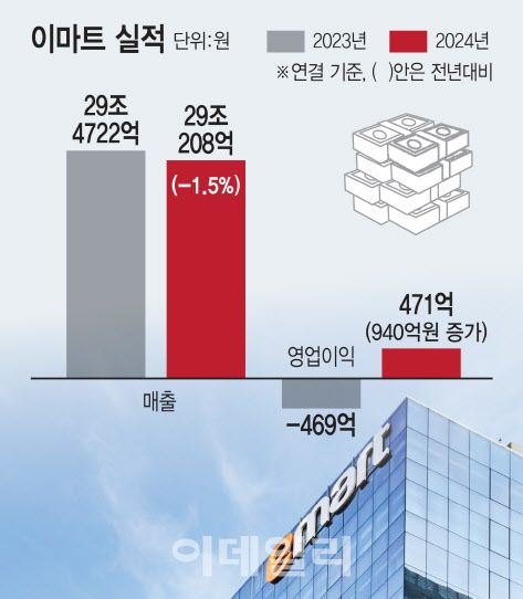 2023년 영업손실 469억원을 기록하며 창사 이래 첫 적자를 기록했던 이마트는 정 회장 취임 1년 만인 지난해 영업이익 471억원으로 흑자전환에 성공했다. 지난해 말 통상임금 적용 확대 판결로 반영된 퇴직충당금 등을 제외하면 실질적인 영업이익은 2603억원으로 최근 3년내 최대 실적이다. 매출액이 29조 209억원으로 전년대비 1.5% 감소한 것을 감안하면, 외형 대신 수익성 개선에 집중한 게 주효했다는 분석이다.