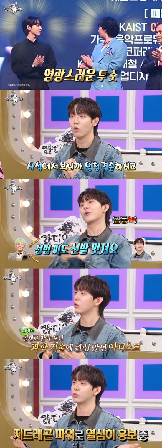 허성범은 "실제로 (지드래곤을) 만나 보니 과학 기술에 관심도 많고 질문도 많이 하시더라"라며 "과학하시는 분들이 고리타분한 면이 있다고 생각한다. 과학은 학계, 산업계의 투자와 관심이 필요하다. 결국 돈이 있어야 연구를 하지 않냐. 홍보의 역할이 필요한데 지드래곤님께서 너무 잘 하고 계신다"고 강조했다.