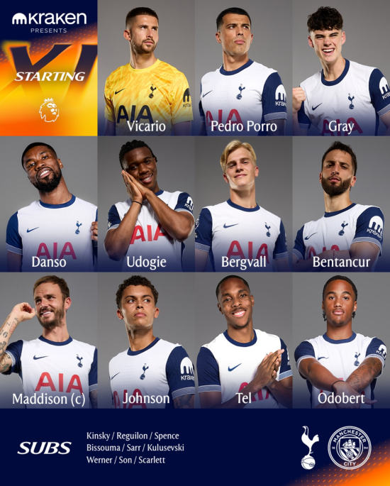 토트넘은 4-3-3 전형으로 나섰다. 굴리에모 비카리오 골키퍼가 장갑을 꼈고 페드로 포로, 아치 그레이, 케빈 단소, 데스티니 우도기가 수비를 구성했다. 중원은 제임스 매디슨, 로드리고 벤탄쿠르, 루카스 베리발이 맡았다. 측면은 브레넌 존슨과 윌송 오도베르, 최전방에 마티스 텔이 출격했다. 손흥민이 벤치에서 대기했다.