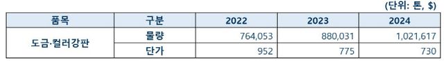 실제 중국산 건축용 도금·컬러강판 수입 물량은 최근 3년간 연 76만t에서 연 102만t까지 34.2% 증가했으며 단가 또한 t당 952달러에서 730달러로 23.3% 낮아졌다.