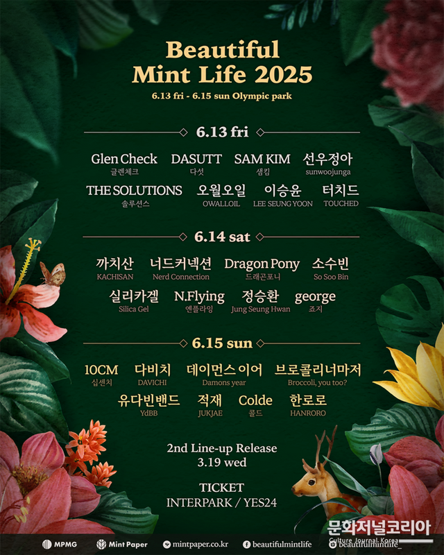 한편 6월 13일부터 15일까지 3일간 송파구 올림픽공원의 3개 스테이지(민트 브리즈 스테이지, 카페 블로썸 하우스, 러빙 포레스트 가든)에서 진행되는 ‘뷰티풀 민트 라이프 2025(Beautiful Mint Life 2025)’의 공식 티켓은 3월 5일부터 인터파크,YES24를 통해 예매할 수 있으며, 2차 라인업은 오는 3월 19일 공개 될 예정이다.
