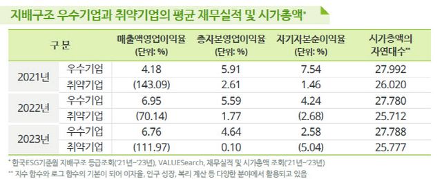 한국 딜로이트 그룹 기업지배기구발전센터가 27일 발간한 ‘기업지배기구 인사이트(Insights)’ 제9호에서 한국ESG기준원이 최근 3년(2021~2023년)간 선정한 지배구조 우수기업과 취약기업의 재무실적을 비교 분석한 결과, 우수기업의 이익률이 취약기업 대비 유의하게 높은 것으로 나타났다.