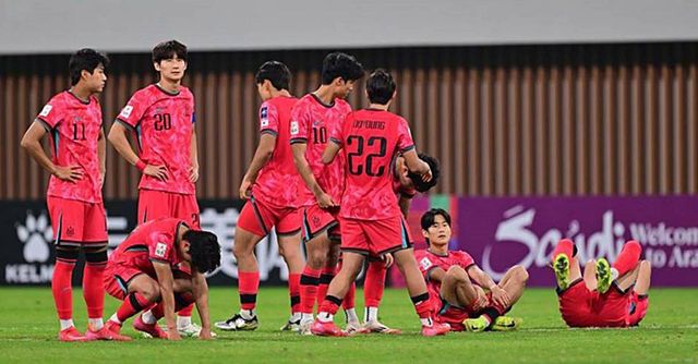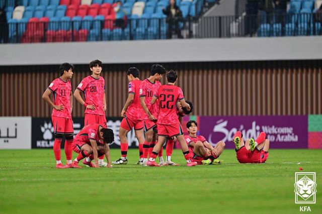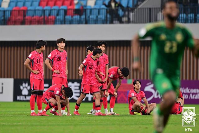 20세 이하(U20) 축구대표팀이 지난 26일 중국 선전 유스풋볼 트레이닝센터에서 열린 2025 아시아축구연맹(AFC) U20 아시안컵 4강전 사우디아라비아와의 경기에서 승부차기로 진 후 아쉬운 표정을 짓고 있다. 이창원 감독이 이끄는 한국 U20 대표팀은 연장전 포함 120분 동안 득점 없이 비긴 뒤 승부차기에서 2-3으로 졌다. 결승 진출에 실패하면서 13년 만에 우승 꿈도 무산됐다 / 뉴스1(대한축구협회 제공)