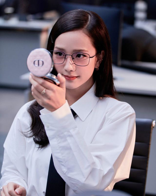 뿔테 안경에 넥타이를 메고 긱시크 룩을 연출한 지수는 크리스챤 디올 뷰티의 메이크업 아이템들로 시크한 꾸뛰르 메이크업을 완성했습니다. NEW ‘디올 포에버 하이드라 글로우 메쉬 쿠션 #1N’으로 자연스럽고 건강한 글로우 베이스를 연출했으며, 눈에는 퍼플과 브라운이 섞인 모브 뉴트럴 톤의 ‘5 꿀뢰르 #669 소프트 캐시미어‘를 사용해 우아하면서도 고급스러운 느낌을 더했죠. 또한 은은한 쉬머가 돋보이는 누드톤 블러셔 ‘루즈 블러쉬 #449 당상트’를 사용해 혈색을 더하고, 브릭 레드 컬러의 ‘디올 어딕트 립스틱 #DIOR8’에 ‘디올 어딕트 립 맥시마이저 #012 로즈우드’를 얹어 따듯한 느낌의 립을 표현했습니다.