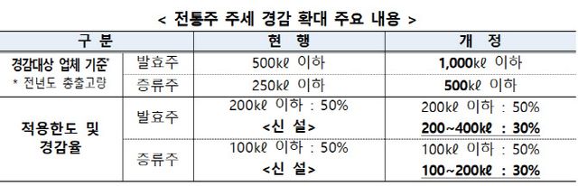 먼저 전통주 제조업체에 대한 주세 겸강 기준은 직전년도 총출고량 기준 발효주류 500kl(킬로리터), 증류주류 250kl 이하인 업체만 주세 감면 혜택을 받았으나 발효주류 1,000kl, 증류주류 500kl 이하인 업체로 확대한다.