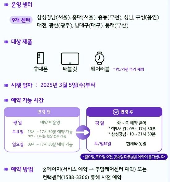 27일 삼성전자서비스에 따르면 주말 케어 센터는 다음 달 5일부터 토요일과 일요일에 제공하던 예약 서비스를 평일(화요일∼금요일)까지 확대 운영한다.