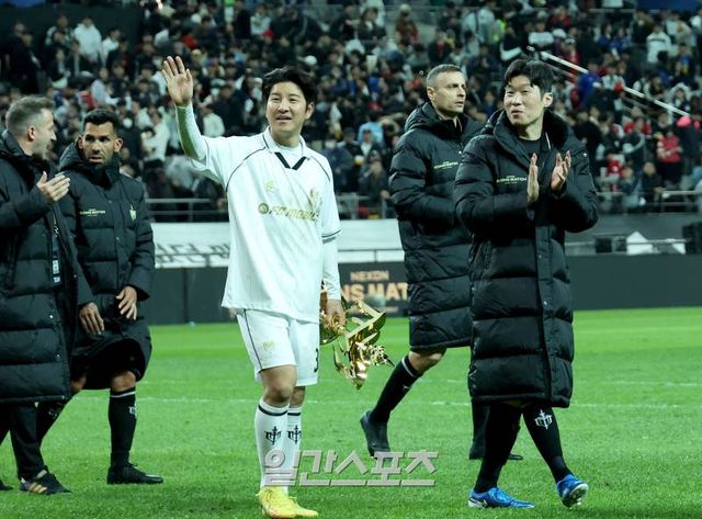 경기 후 박주호, 박지성 등 양팀 선수이 그라운드를 돌며 관중에 인사하고 있다.