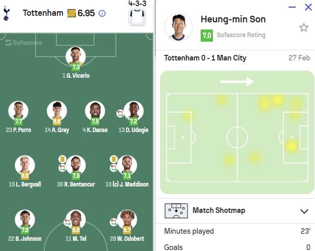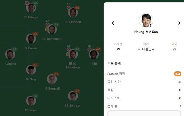 손흥민은 전반전 벤치에 있었다. 후반전 교체 출전해 총 23분 활약했다. 손흥민은 이번 경기 슈팅 1회, 기회 창출 1회, 정확한 패스 7회(78%)를 보여줬다. 또 볼 터치 11회, 상대 박스 내에서 터치 2회, 공 뺏김 0회를 기록했다.