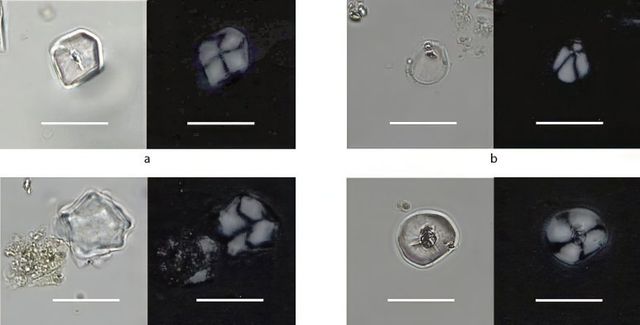 곡물을 가는 돌에서 추출한 네 가지 유형의 전분 과립입니다. 현미경으로 촬영한 사진을 400배 확대하여 촬영했습니다. / 출처: Cristina N. Patús, HUMANE, Barcelona