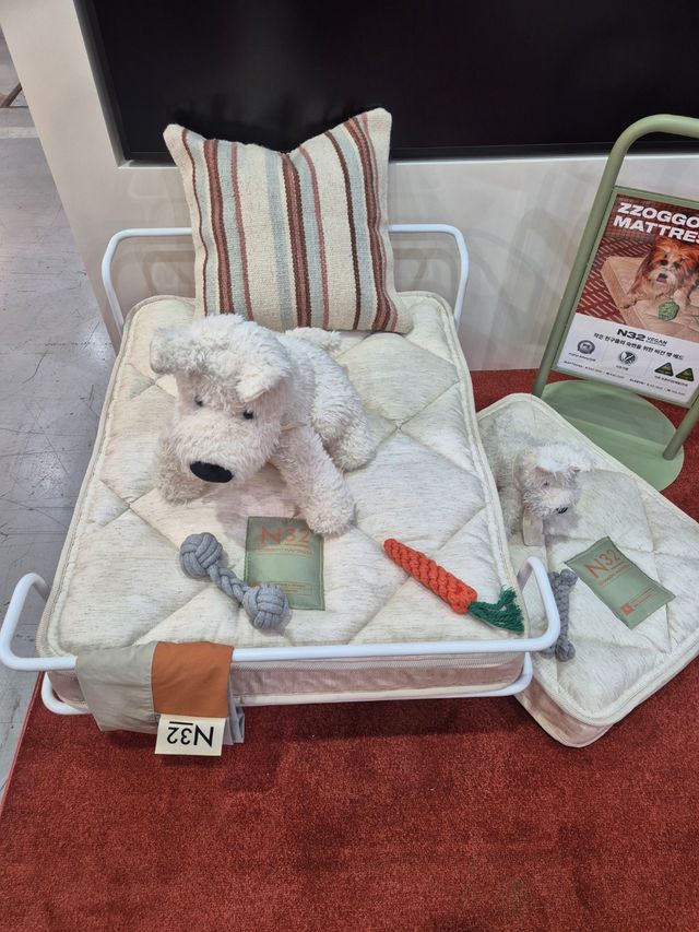 이날 N32에서 출시한 반려동물용 매트리스 '쪼꼬미'도 최초로 선보였다. 아이슬란드 씨셀과 천연 식물성 소재 린넨을 함유한 비건 매트리스 제품으로, 발수 코팅으로 생활 방수가 가능하고 외출시에도 사용할 수 있는 손잡이가 있다.