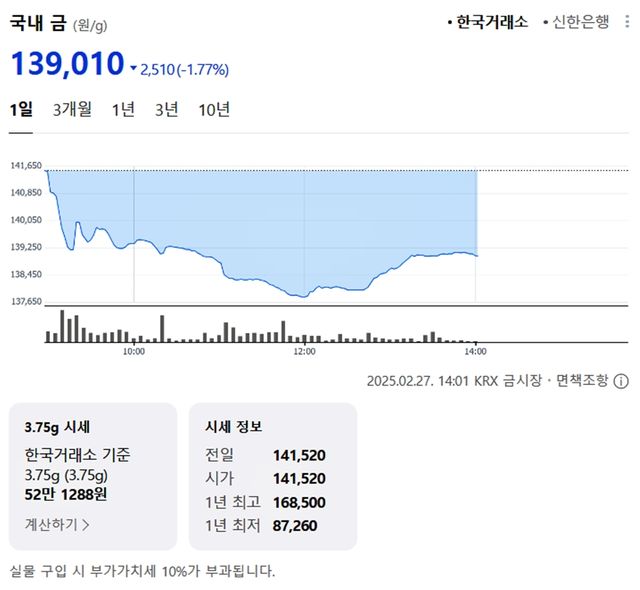 국내 금시세(금값)가 27일 오후 하락세(전 거래일 대비)를 보이고 있다.