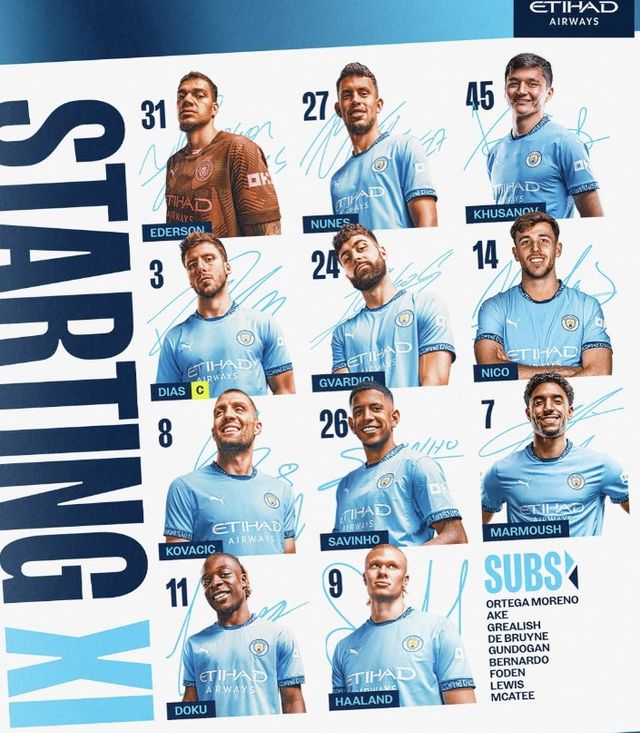 에데르송이 골키퍼 장갑을 착용했다. 요슈코 그바르디올, 후벵 디아스, 압두코디르 후사노프, 마테우스 누네스가 수비진을 구성했다. 마테오 코바치치와 니코 곤살레스가 그 앞에 나왔다. 제레미 도쿠, 오마르 마르무시, 사비우가 2선에 있었고 최전방에 홀란이 출격했다.