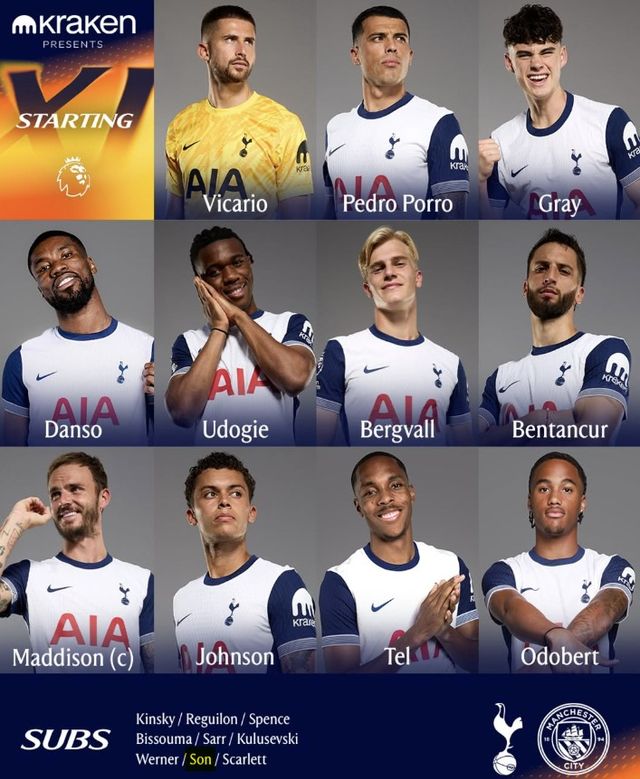 굴리엘모 비카리오가 골문을 지켰다. 페드로 포로, 아치 그레이, 케빈 단소, 데스티니 우도기가 3선으로 나왔다. 루카스 베리발, 로드리고 벤탄쿠르, 제임스 매디슨이 2선을 구성했다. 브레넌 존슨, 마티스 텔, 윌슨 오도베르가 공격진으로 나섰다.
