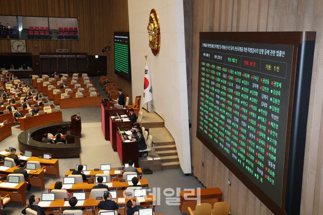 27일 정치권에 따르면 명태균 특검법은 이날 오후 국회 본회의에서 재석의원 274명 중 찬성 182명, 반대 91명, 기권 1명으로 국회 본회의를 통과했다.