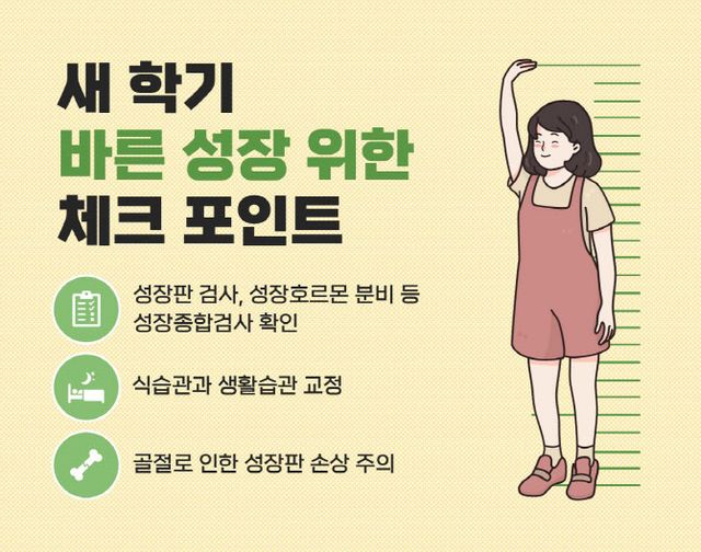 아이의 성장은 유전적인 영향이 크지만 환경, 영양, 운동 등 후천적인 요인도 크게 작용한다. 만약 또래보다 키가 눈에 띄게 작다면 성장 검사를 통해 원인 질환 여부, 영양 상태, 수면시간, 호르몬 결핍, 성장판 손상 여부, 뼈 나이 등을 종합적으로 파악해 잠재적 성장인자를 키우고 위험인자를 바로잡을 수 있다. 또 이 시기에 골절 등으로 부상을 입으면 성장판 손상으로 성장에 영향을 미칠 수도 있다.