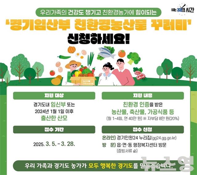 (뉴스영 이현정 기자) 경기도가 임산부에 친환경농산물 꾸러미를 지원하는 ‘경기임산부 친환경농산물 지원’ 대상자를 3월 5일부터 28일까지 모집한다.