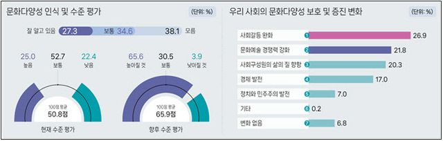 아울러 5년 후 문화다양성 수준은 65.9점으로 다소 높아질 것이란 전망이 나왔다. 문화다양성이 높아지면 사회갈등 완화(26.9%), 문화예술 경쟁력 강화(21.8%), 사회구성원 삶의 질 향상(20.3%) 등에 기여할 것이란 기대다.