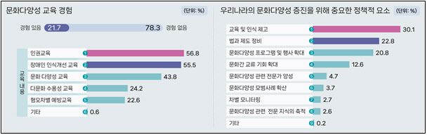문화다양성 증진을 위한 정책으로는 교육 및 인식 제고(30.1%)가 가장 필요하다고 꼽았다. 법과 제도 정비(22.8%), 문화다양성 프로그램 및 행사 확대(20.8%) 등이 뒤를 이었다.